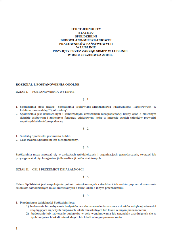 Statut Spółdzielni Budowlano-Mieszkaniowej Pracowników Państwowych w Lublinie, przyjęty przez Zarząd SBMPP w 2010 roku.