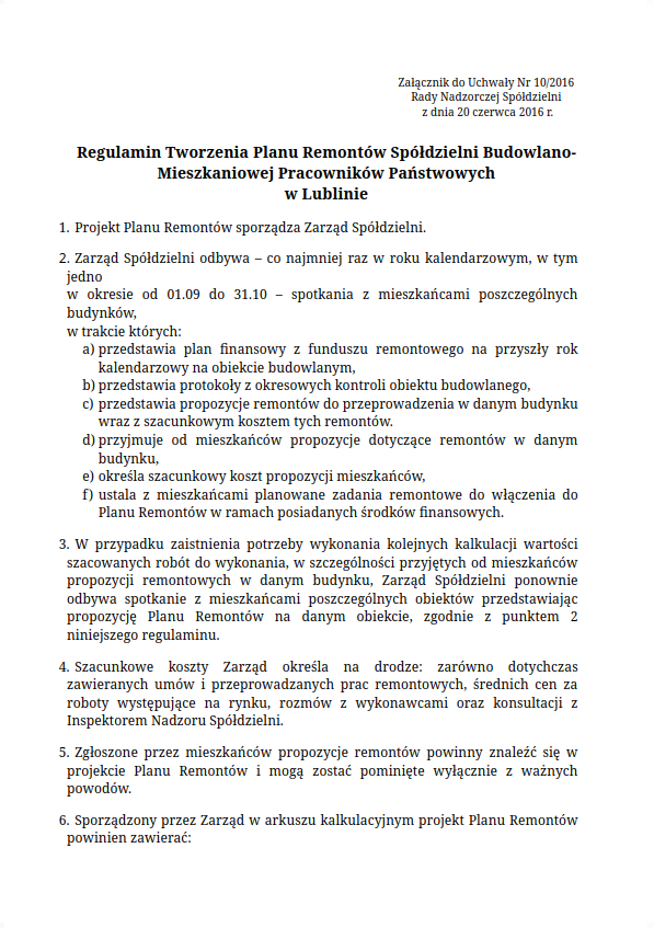 Regulamin Tworzenia Planu Remontów Spółdzielni Budowlano-Mieszkaniowej Pracowników Państwowych w Lublinie.