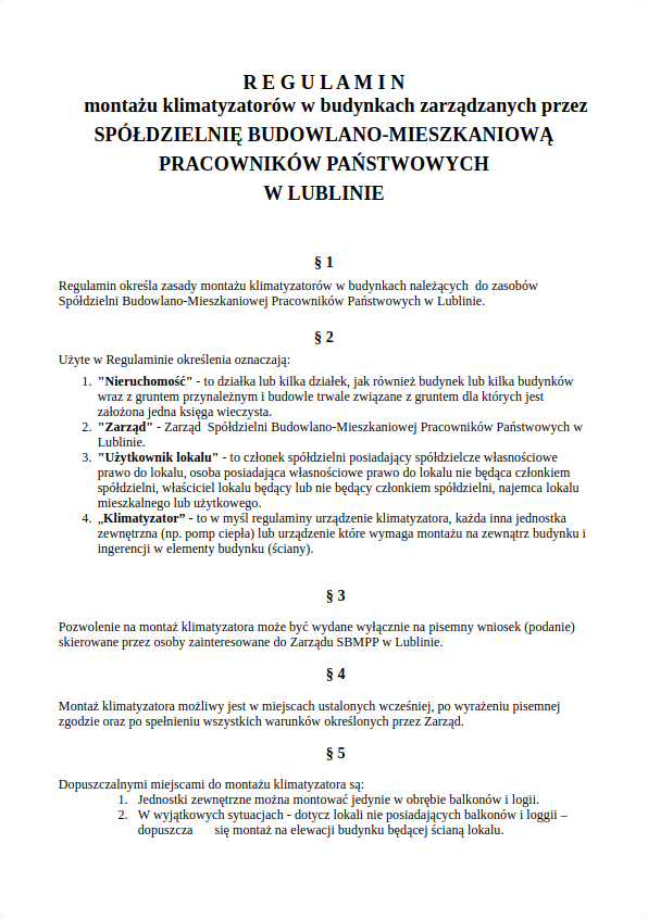 Regulamin określa zasady montażu klimatyzatorów w budynkach należących do zasobów Spółdzielni Budowlano-Mieszkaniowe...