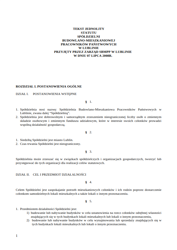 Statut Spółdzielni Budowlano-Mieszkaniowej Pracowników Państwowych w Lublinie, przyjęty przez Zarząd SBMPP w 2008 roku.
