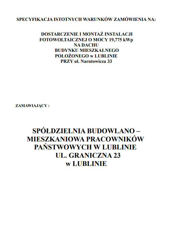 DOSTARCZENIE I MONTAŻ INSTALACJI FOTOWOLTAICZNEJ O MOCY 19,775 kWp NA DACHU BUDYNKU MIESZKALNEGO POŁOŻONEGO w LUBLINIE PRZY ul. Narutowicza 33